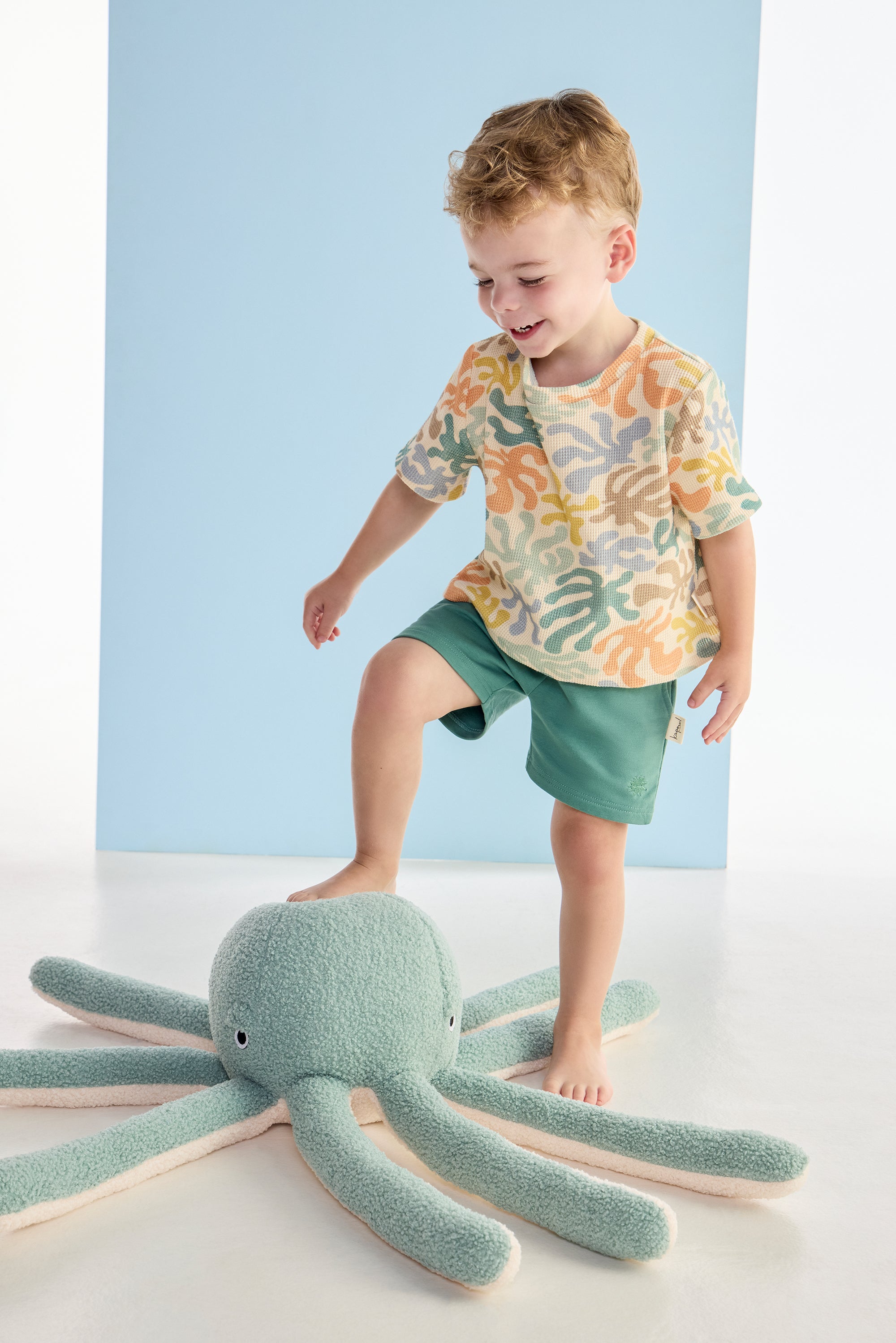 The Coral Waffle T-shirt combines a vibrant coral hue with a cozy waffle texture, making it a playful and comfy choice for kids. Its breathable fabric keeps little ones comfortable during playtime, while the unique waffle pattern adds a fun twist to their everyday wardrobe. Pair with the Deep Sea shorts to complete the look. 95% cotton, 5% spandex.