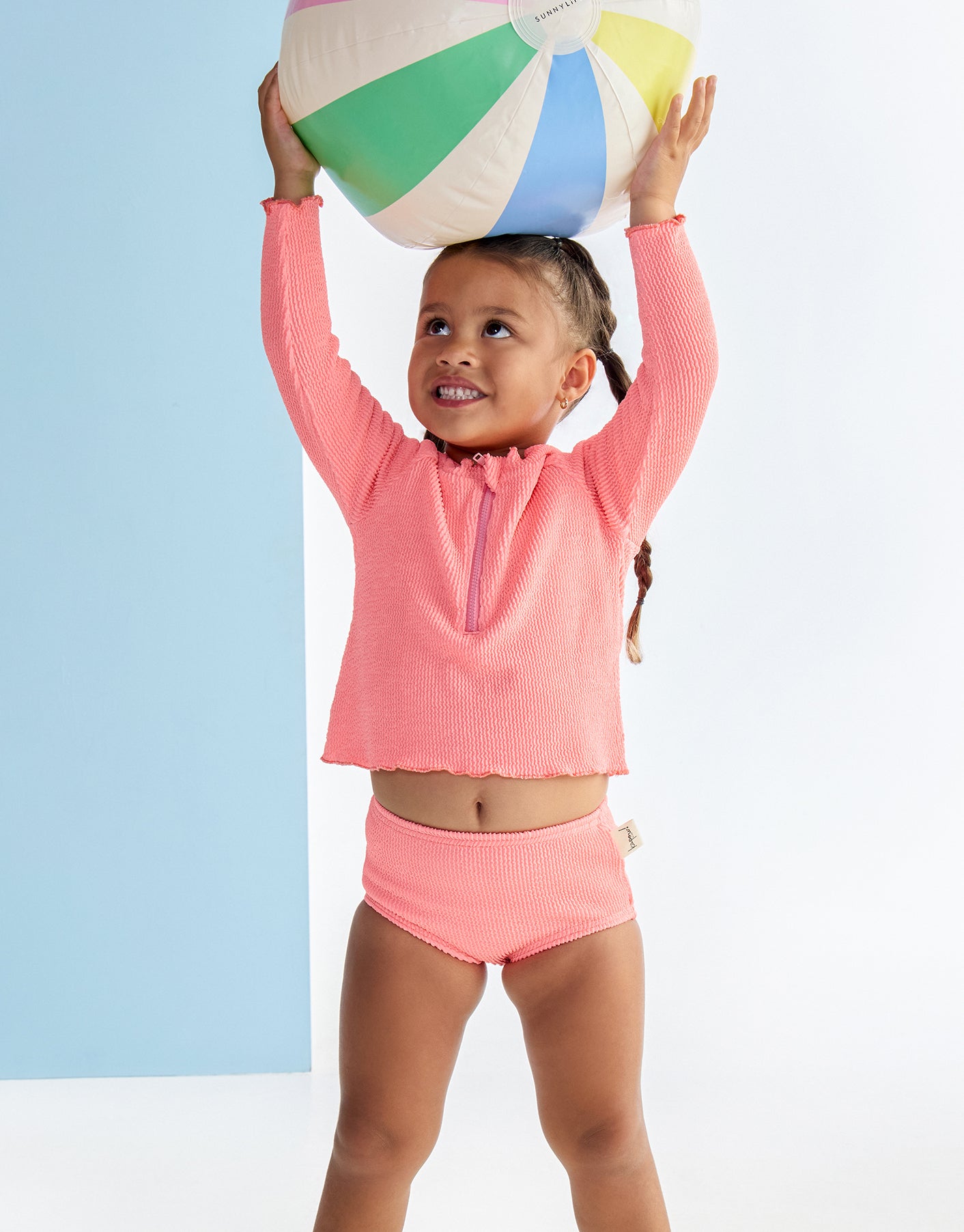 Get ready to make a splash with our Neon Crinkle Swim Set! This vibrant set not only turns heads with its fun neon pink colour and playful crinkle texture but also protects young skin with UPF50+ sun protection. Perfect for endless pool days or beach adventures, it’s designed to keep your little one comfy, cool, and safe in the sun. Dive into summer fun with style and confidence!