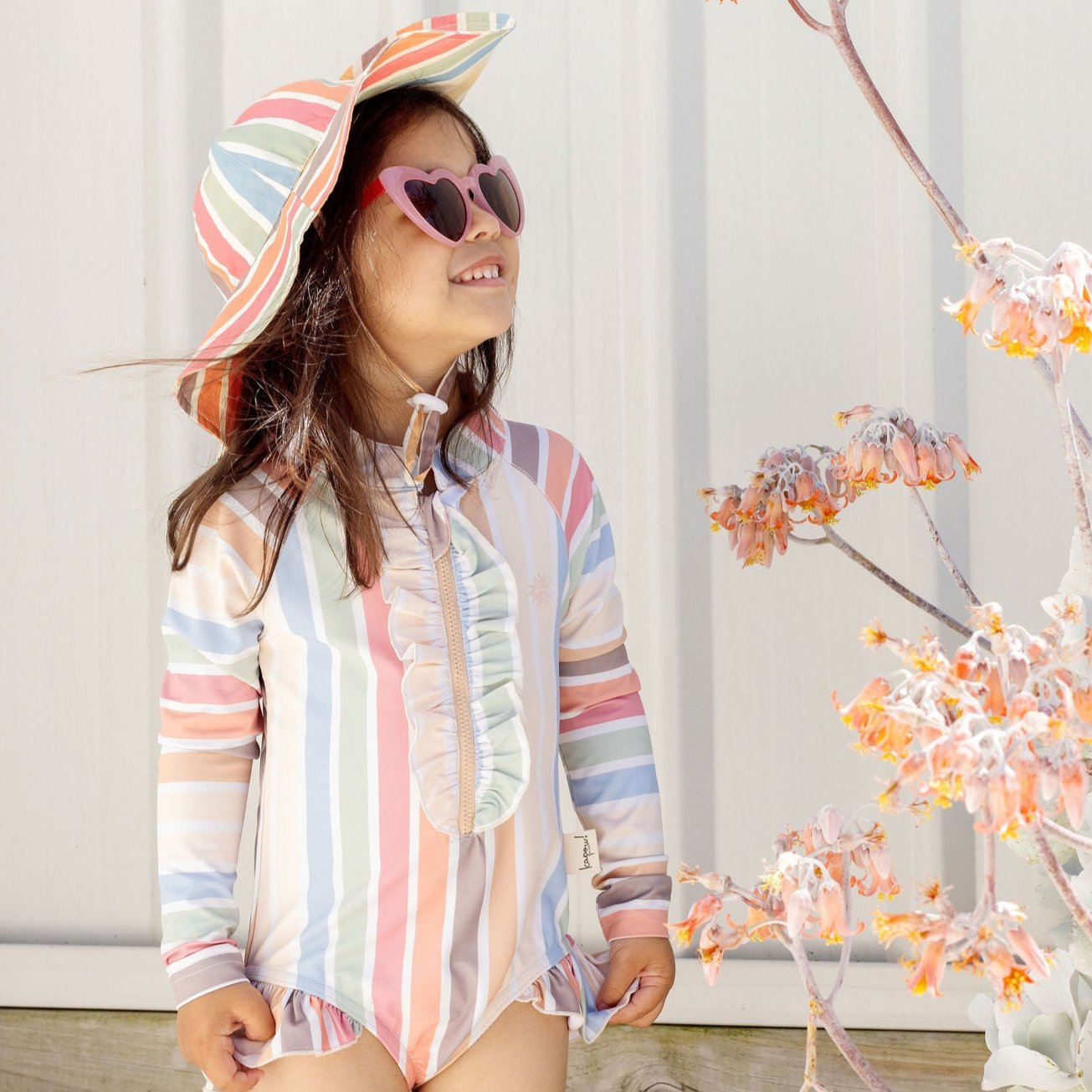 Surf's up in style with this Sun Stripe Rashie Swimsuit! Protect your skin from the sun's harmful rays with our high quality UPF50+ fabric while rocking a playful and unique design. Perfect for a day at the beach or lounging by the pool. Grab one before they're gone!