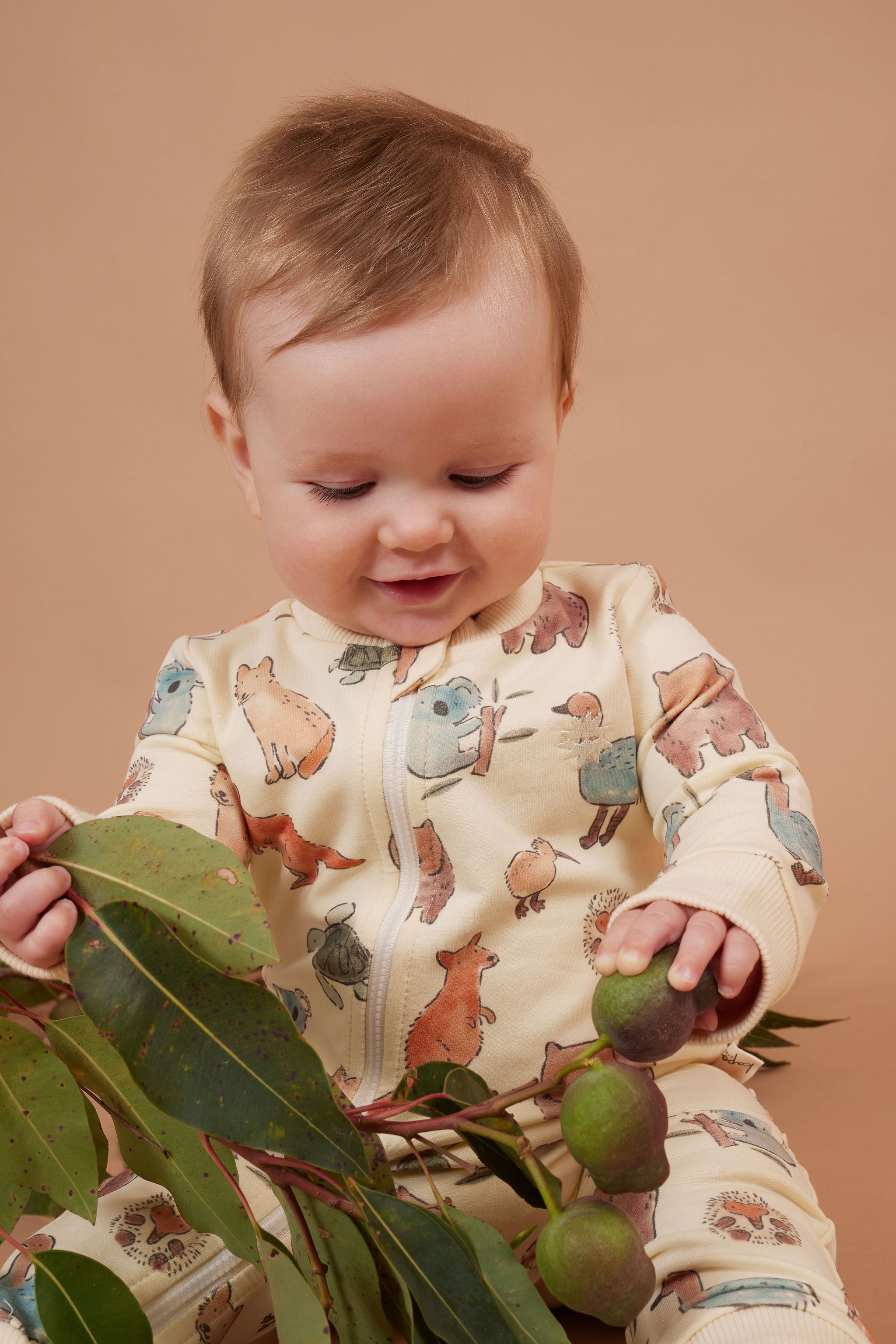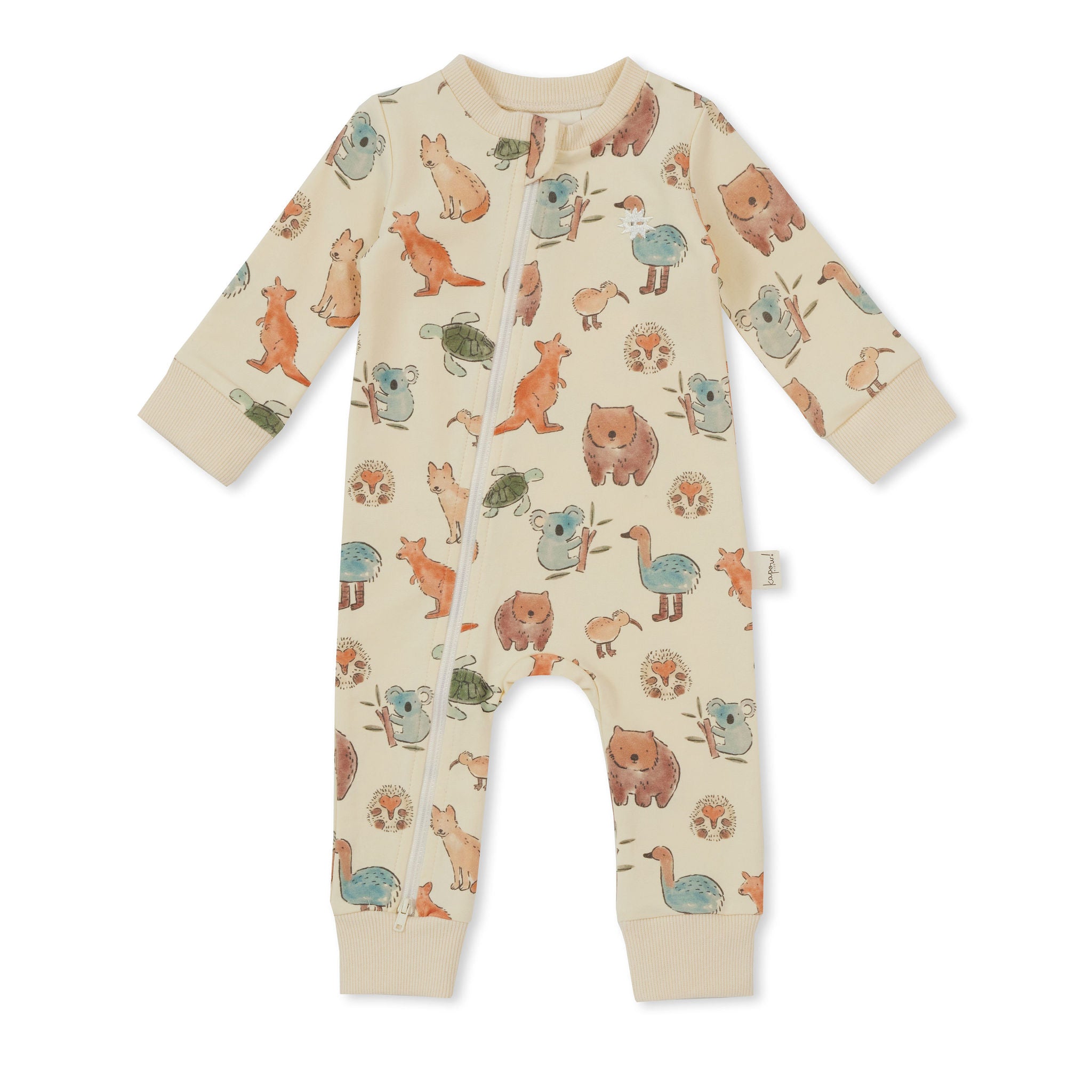 Get ready for an adventure with the Wild Wonders Zip All in one! This all-in-one outfit features adorable Aussie animals and a convenient 2-way zip closure. Perfect for exploring the great outdoors, this zip all in one will keep your little one warm and comfy while they discover the wonders of the wild. Made from soft 95% cotton and 5% spandex french terry. Designed in Melbourne, Australia, made ethically and slowly in China.